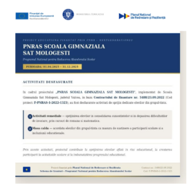 În perioada aprilie -mai 2023 Școala Gimnazială Mologești a continuat derularea proiectului cu fonduri guvernamentale prin PNRR destinat copiilor din ciclul gimnazial aflați în risc de abandon școlar din cauza numărului mare de absențe și a mediilor scăzute, valoare fără T.V.A. a grantului fiind de 140 000 euro.